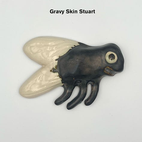Welcome to 'Fly on the Wall', a series of one off artist proofs made while testing out glazes on the Flying Fly sets. These one off collectors pieces are all individually named and signed on the back. Stick one on the wall and let it watch you 24/7 yeah? They're all about 12cm wide, (apart from Collapsed Thorax Mike who is more like 16.5cm wide and B52 who is coming in at 19cm). Cheers!